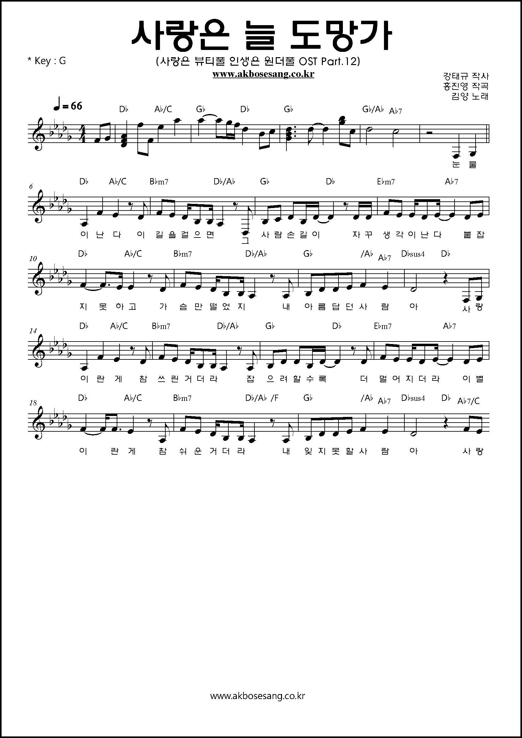 항목 내용 곡명 사랑은 늘 도망가 아티스트 김양 (Kim Yang) 형식 멜로디 (Melody Line) 특징 깔끔한 채보 / 가사 포함
